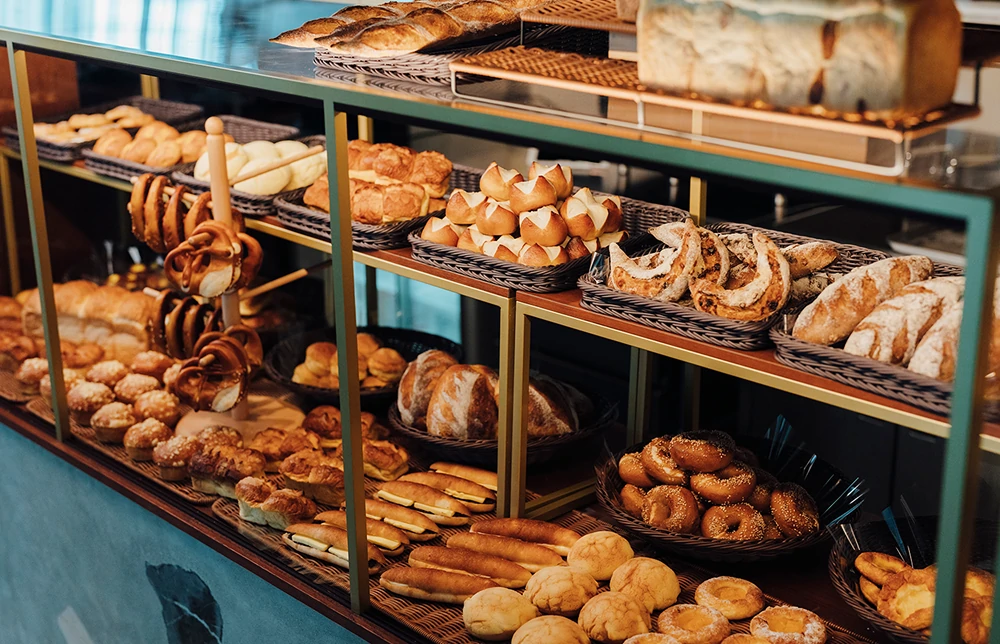 国産小麦100%、添加物を極力使わず、毎日約50種類のパンを店内で焼き上げています。天然酵母レーズン種を使用したカンパーニュやブレッツェルなどのハード系から、菓子パン、総菜パンまで、素材にこだわったベーカリーをご提供します。